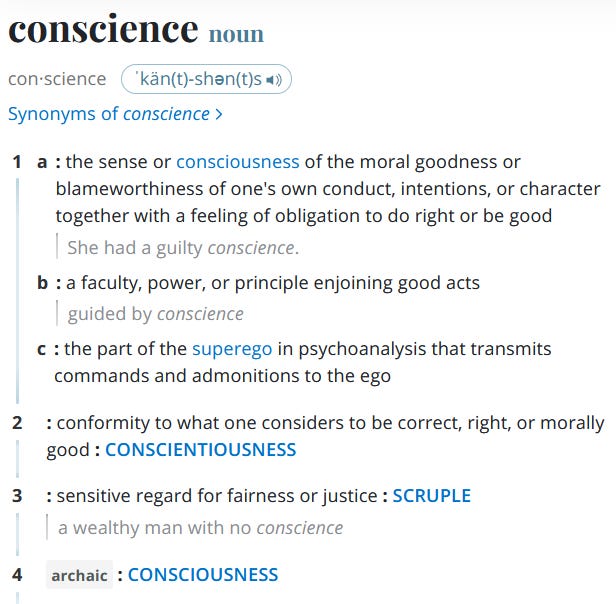 According to psychologists, individual conscience is the “superego” that commands the ego to conform and do what is good and morally right. The commands of the super ego are often rooted in guilt, or more accurately the aversion to guilt, which then drives “moral” behavior in order to keep the ego in tact [as in: I’m still a good person and deserve to live—and hey, at least I’m better than that guy—but gosh, I wonder what they think of me—oh no, what if they don’t think I’m a good person!].