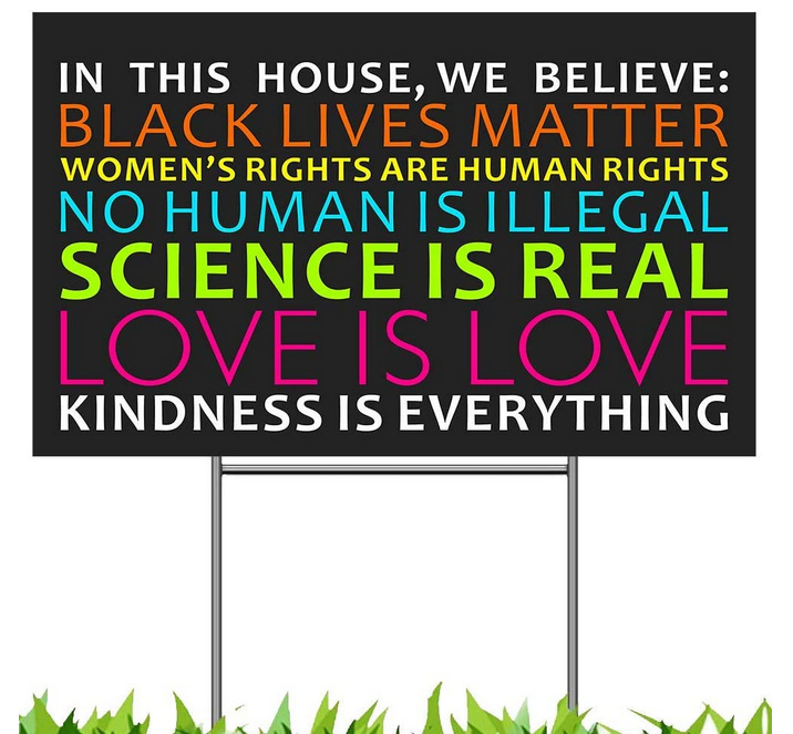 Don’t underestimate the power of a yard sign! This sign implies that believing these things makes you a good human being. If you don’t believe these things, you are not a good human being. You are a bad human being. We don’t like bad human beings, so you better stay away, or else we will viciously attack your ego, call you names, and make you feel small, so that you know just how much of a lesser human being you are.